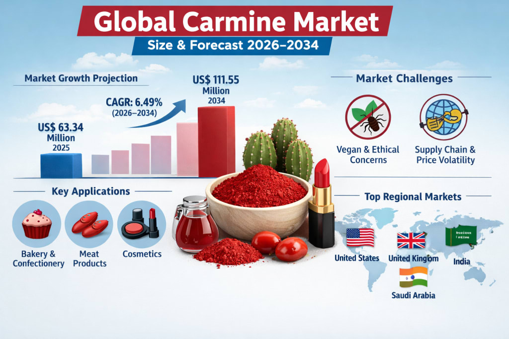 The global Carmine Market is expected to experience steady expansion over the coming decade as industries increasingly shift toward natural ingredients and clean-label formulations. According to market projections, the market is anticipated to grow from US$ 63.34 Million in 2025 to US$ 111.55 Million by 2034, registering a Compound Annual Growth Rate (CAGR) of 6.49% from 2026 to 2034.