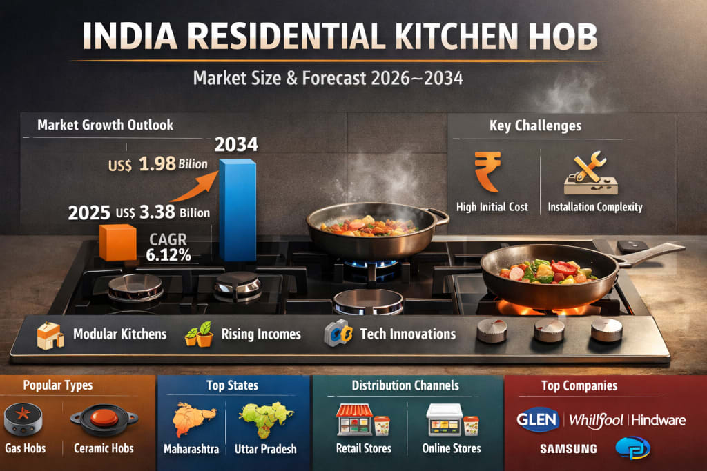 According to Renub Research, the India residential kitchen hob market is expected to expand from US$ 1.98 Billion in 2025 to US$ 3.38 Billion by 2034, growing at a compound annual growth rate (CAGR) of 6.12% between 2026 and 2034. This growth reflects the rapid transformation of Indian kitchens as consumers increasingly invest in modern appliances that combine functionality with design.