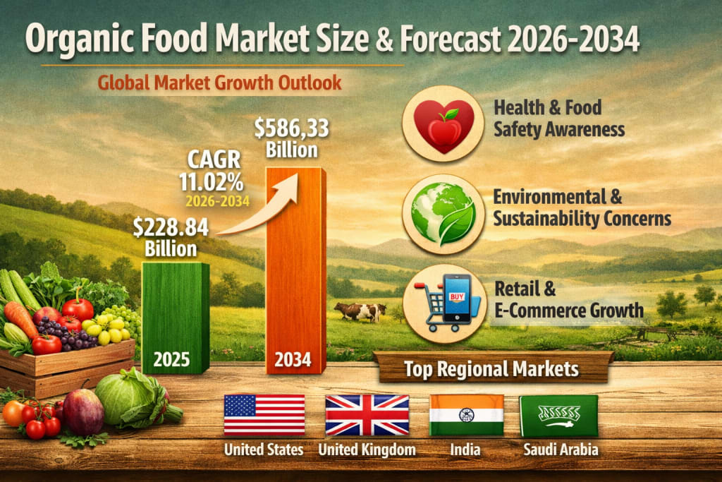 The global organic food market is experiencing remarkable growth as consumers increasingly prioritize health, environmental sustainability, and chemical-free food choices. According to market analysis by Renub Research, the organic food market is projected to grow from US$ 228.84 Billion in 2025 to US$ 586.33 Billion by 2034, expanding at a Compound Annual Growth Rate (CAGR) of 11.02% between 2026 and 2034.
