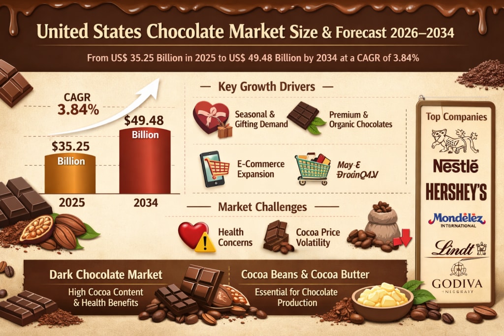 The United States Chocolate Market is projected to experience steady expansion over the coming years, reflecting the enduring popularity of chocolate among American consumers. According to Renub Research, the market is expected to grow from US$ 35.25 Billion in 2025 to US$ 49.48 Billion by 2034, registering a compound annual growth rate (CAGR) of 3.84% during the forecast period from 2026 to 2034.