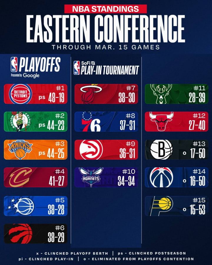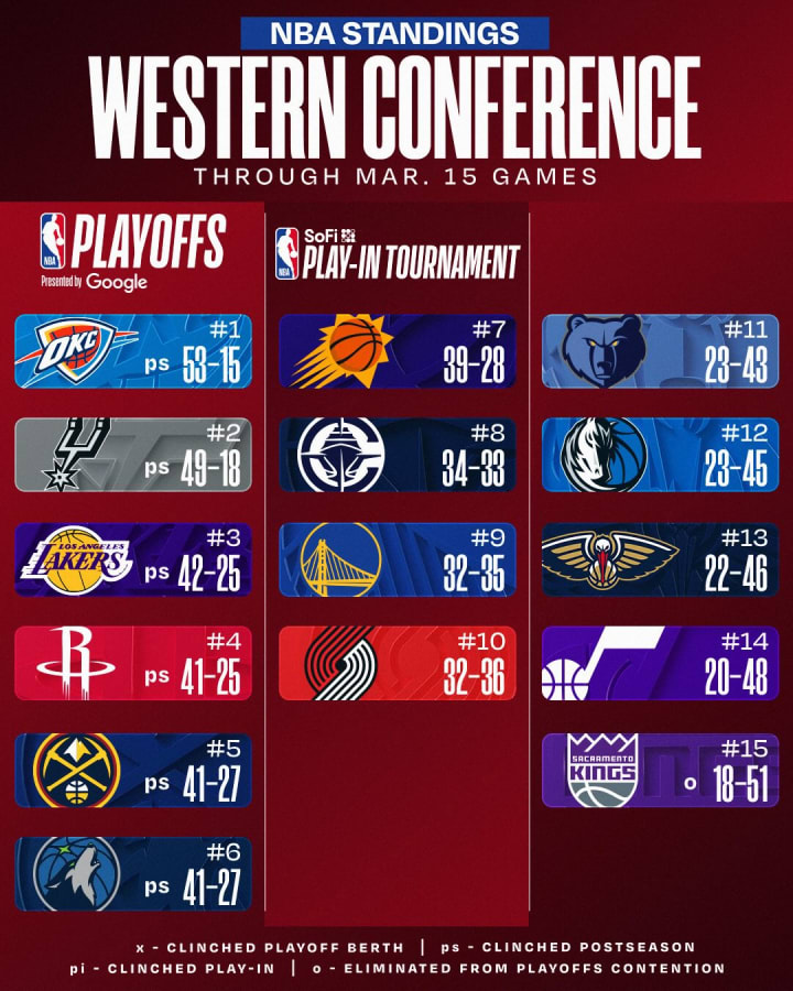 Regarding the Play-In picture, the Phoenix Suns sit at the #7 spot at 39-28, while the Los Angeles Clippers are at #8 at 34-33. The Golden State Warriors have lost five straight but still sit at #9, while the Portland Trail Blazers remain at #10. Overall, the past week saw seven teams join the postseason party, four from the West and three from the East, and as these standings show, they finally got the right letters up, because two weeks ago, they put the "x" next to OKC, but "x" means a playoff spot. OKC isn't officially in the playoffs yet. As the pics show, they have the right letters: "ps" for postseason.