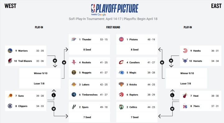 Here's the playoff bracket if the season ended at this point. In the Eastern Conference, the Knicks would be facing the Raptors in one series, while the Cavaliers and Magic would face off in another series. The East's Play-In matchups would see the Heat host the Sixers, with the winner facing the Celtics, while the Hawks would host the Hornets, with the winner advancing to the #8 seed game, which would be for the right to face the Pistons. In the West, the Lakers would face the Timberwolves in one series, while the Rockets and Nuggets would face off in another series. The West's Play-In matchups would see the Suns host the Clippers, with the winner facing the Spurs, while the Warriors would host the Blazers, for a shot to play for the #8 seed and the right to face the Thunder. The standings could change at any time.
